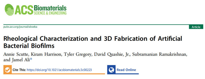 生物膜因能附着于软组织,在癌症、上呼吸道感染等多种疾病的进展中发挥重要作用。尽管平面基底上影响生物膜形成的因素已得到广泛研究,但对 3D 基质中生物膜的生长及相互作用的了解仍有限。由于3D生物膜比2D生物膜更复杂且更难治疗,开发能密切模拟软组织中天然细菌群落化学和力学特性的生物膜模型,对于研发下一代抗菌化合物和疗法至关重要。FAMU-FSU工程学院化学与生物医学工程系Subramanian Ramakrishnan教授和 Jamel Ali教授团队,采用挤出式生物打印,通过构建两种藻酸盐基水凝胶并封装不同浓度的鼠伤寒沙门氏菌,旨在理解三维基质环境中粘弹性效应对生物膜的影响。该文章名为“Rheological Characterization and 3D Fabrication of Artificial Bacterial Biofilms”,发表在ACS Biomaterials Science & Engineering。结果表明,水凝胶表现出剪切稀化行为,并且细菌浓度增加到1×107CFU mL-1对水凝胶前驱体模量和低剪切粘度没有显着影响。然而,将细菌浓度提高到1 × 1010CFU mL-1显着降低水凝胶剪切粘度和模量。利用基于挤出的生物打印,最佳打印参数(Pr > 0.8)在4天的孵育期内对细菌活力的影响最小(>80%)。此外,随着时间的推移,较低浓度的细菌比细胞浓度较高的水凝胶形成更大的聚集体。总之,3D生物膜生长取决于初始细菌密度和基质刚性影响。进一步开发物理化学调整的生物打印细菌群落将有助于了解其3D环境中的细菌相互作用,并为构建包含生物膜的体外组织模型用于高通量药物筛选提供技术支撑。