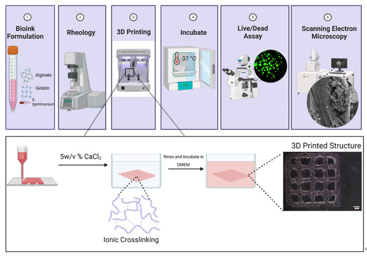 采用SunP Biomaker V2进行基于挤出的3D生物打印。水凝胶被打印为10×10×1 mm的结构,该结构通过CAD软件预先设计,采用直线填充模式,填充密度为20%,层高达0.5 mm。 将无细胞水凝胶装入3 mL注射器中,在25°C条件下,使用22号锥形尖端针头(内径=0.41 mm)进行打印。为表征水凝胶的可打印性,将水凝胶样品逐层打印在1 mm厚的载玻片上,通过成像评估丝宽和孔径大小。研究了三种初始接种浓度的鼠伤寒沙门氏菌(1×105、106、107CFU/mL)用于打印载菌结构。将所需浓度的细菌离心pellet,重悬于50 μL 1×PBS中,加入3 mL水凝胶溶液,并用立体移液管反复抽吸混合。载菌水凝胶支架的打印速度为5 mm/s,挤出速率为0.6 mm3/s。生物打印结构用5%(w/v)CaCl₂溶液交联4分钟,用PBS溶液冲洗两次,然后在添加10% FBS的DMEM培养基中,于37°C、5% CO2条件下培养。随后对载菌结构进行为期4天的培养成像。