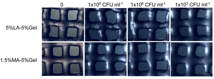 图4. 细菌浓度增加对5% LA-5% Gel和1.5% MA-5% Gel两种水凝胶可打印性的影响。