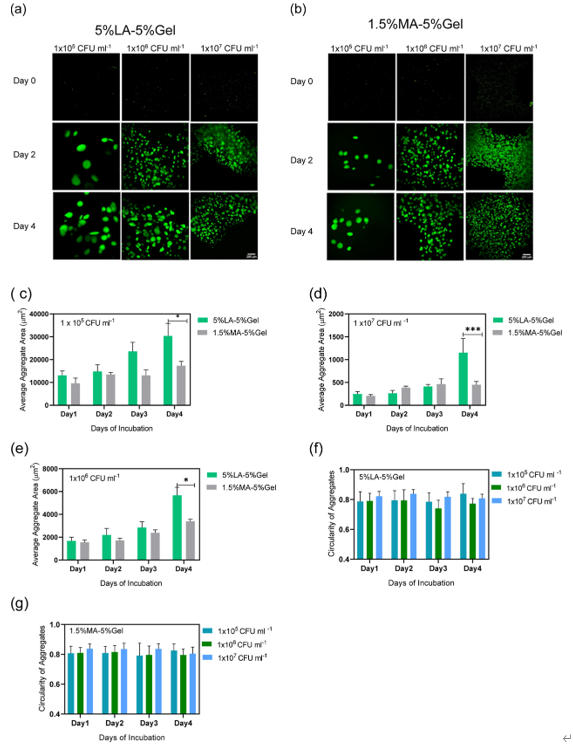 图 6. 5% LA-5% Gel和1.5% MA-5% Gel水凝胶打印结构中细菌聚集体的形态变化与发育过程。