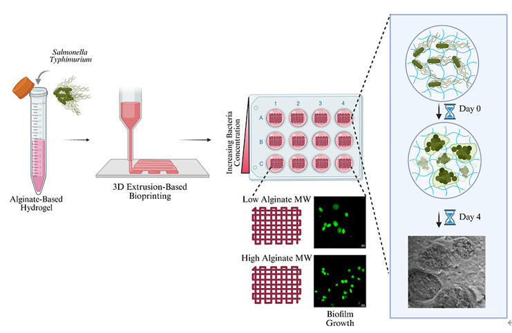 3D生物打印技术,特别是挤出式打印,为解决上述局限提供了潜力。它可精确制造复杂3D结构,模拟天然组织环境。基于藻酸盐和明胶等天然聚合物的生物墨水被广泛探索,但将其用于打印活菌(LM)或生物膜模型仍在发展中,对高细胞密度下生物墨水流变学特性及其如何影响3D环境中生物膜生长的理解尚不足。本研究利用挤出式生物打印,在类组织培养条件下构建3D鼠伤寒沙门氏菌生物膜模型。重点研究了,不同初始细菌浓度对两种分子量藻酸盐水凝胶前体流变特性和可打印性的影响。 聚合物分子量和初始细菌密度对细菌存活率、聚集体形成及形态的影响。结果表明,添加不同浓度的细菌对两种藻酸盐前体的流变特性无显著影响,均能实现高可打印性。该3D打印生物膜模型为研究病原菌在类软组织材料中的相互作用及未来高通量药物筛选提供了新平台。
