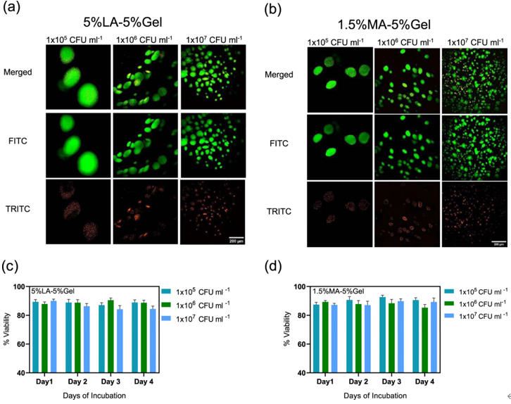 图4. 细菌浓度增加对5% LA-5% Gel和1.5% MA-5% Gel两种水凝胶可打印性的影响。